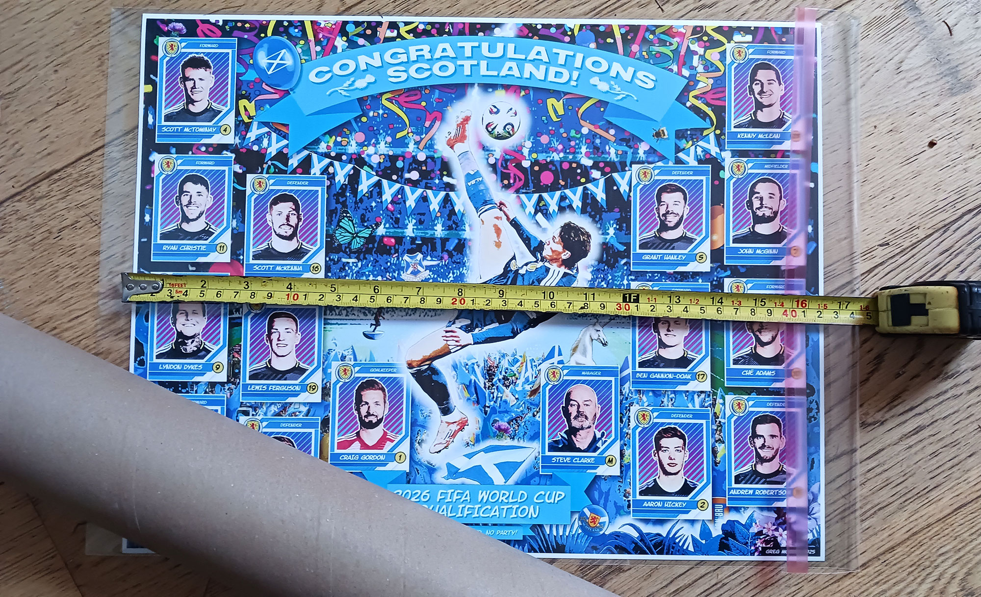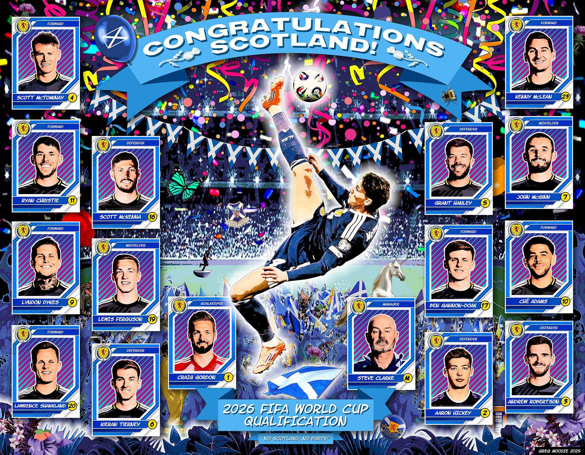 ‘Congratulations Scotland.’ Commemorative print of Scotland’s World Cup qualifying game against Denmark in November 2025. Digital print on 250gsm premium semigloss paper. Signed on reverse.